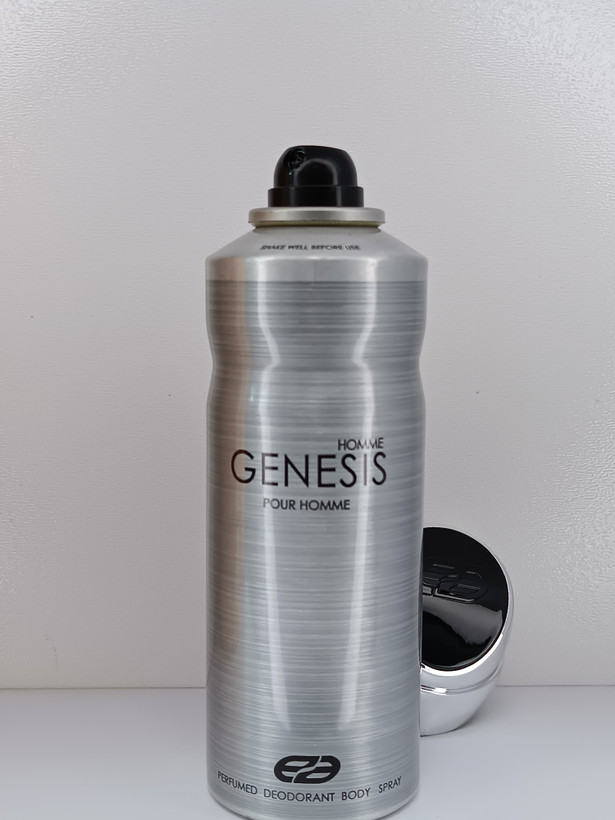 Genesis Pour Homme یک اسپری خوشبوکننده بدن مردانه است که در حجم 200 میلیلیتر عرضه میشود. طراحی فلزی نقرهای با نازل مشکی و شعار "Shake well before use" نشاندهنده ترکیب خاص و اسپریپذیر بودن آن است. این محصول مکملی برای عطر اصلی Genesis Homme بوده و رایحهای مشابه آن دارد.