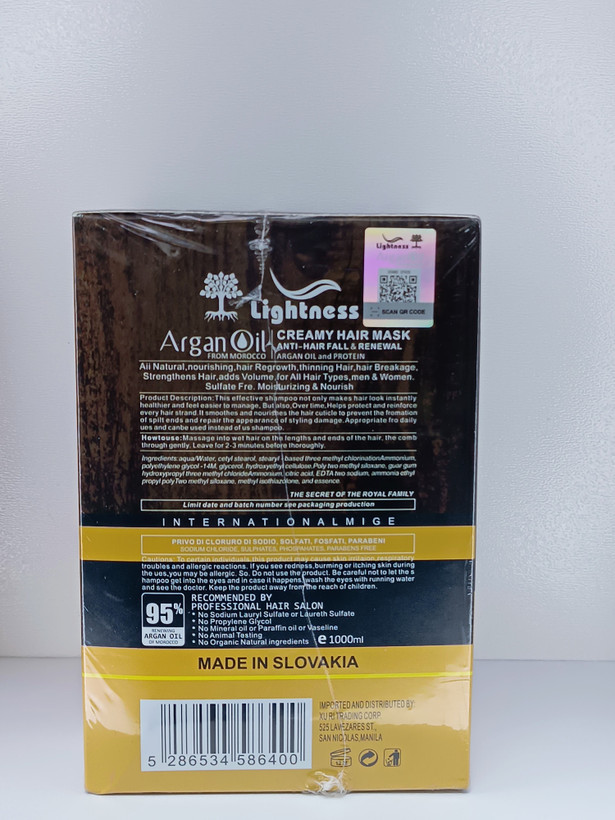 ماسک موی Argan Oil from Morocco با حجم ۱۰۰۰ میلیلیتر، یک درمان عمیق برای موهای آسیبدیده، نازک، شکننده و دارای ریزش است. این محصول ساخت کشور اسلواکی بوده و توسط سالنهای حرفهای آرایش مو توصیه شده است.