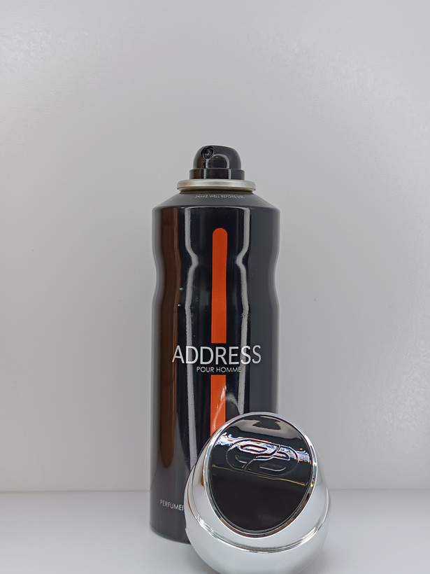 ADDRESS POUR HOMME یک ادو تویلت مردانه که در حجم 200 میلیلیتر عرضه میشود. طراحی بطری مشکی با نوار نارنجی، نمادی از انرژی، جسارت و مدرنیته است. شعار "Shake well before use" نشاندهنده ترکیب خاص اسپریپذیر آن است.
